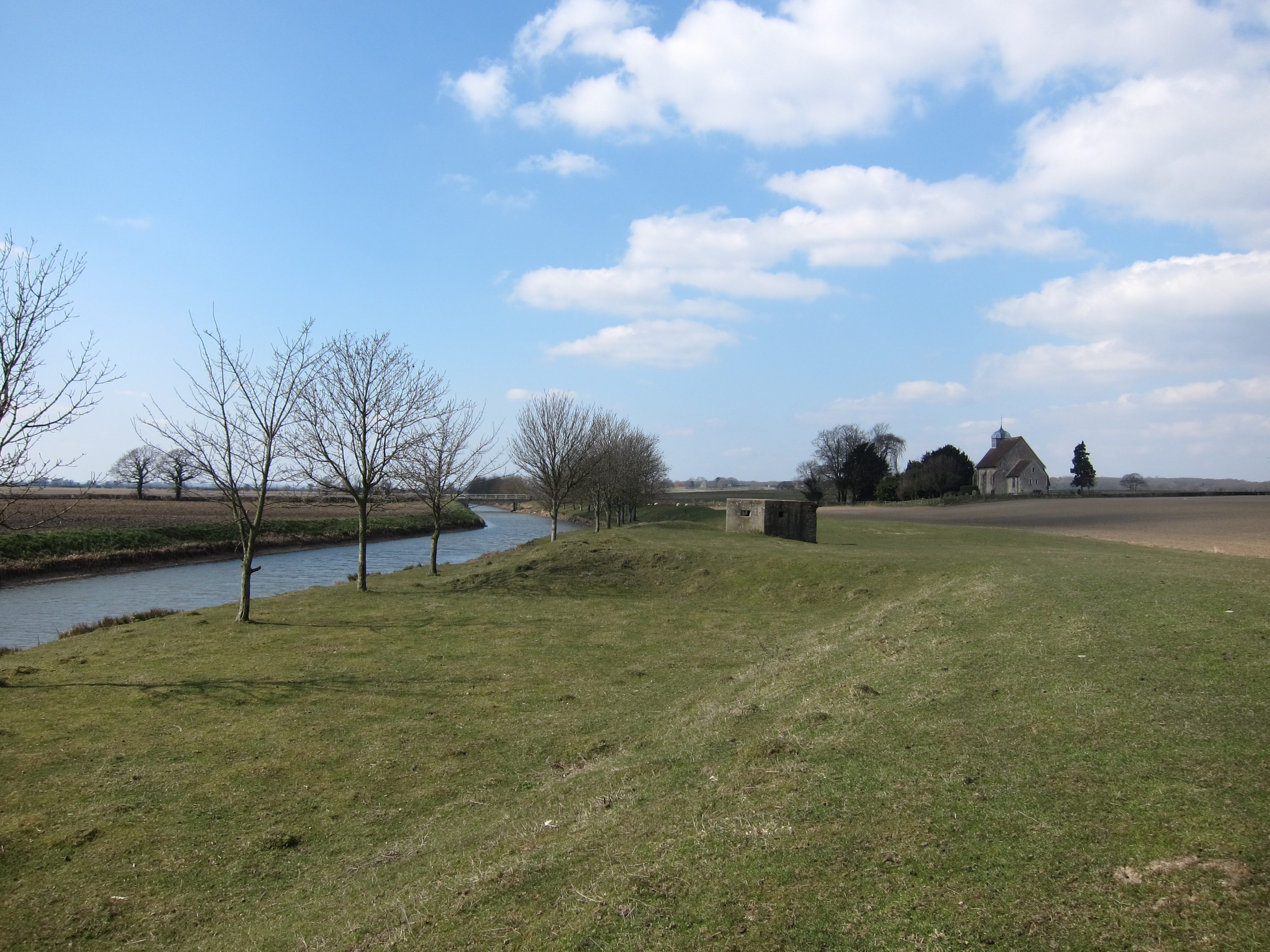 The Royal Military Road and canal stretch for some 28 miles, with a pill box overlooking a dog leg in the canal about every mile, and a crossing every 2 – 3 miles with the old crossing keepers’ cottages still in evidence. On the inland side (north) a series of mediaeval churches lined the route, and to the south the expanse of Romney Marsh stretches down to the sea.