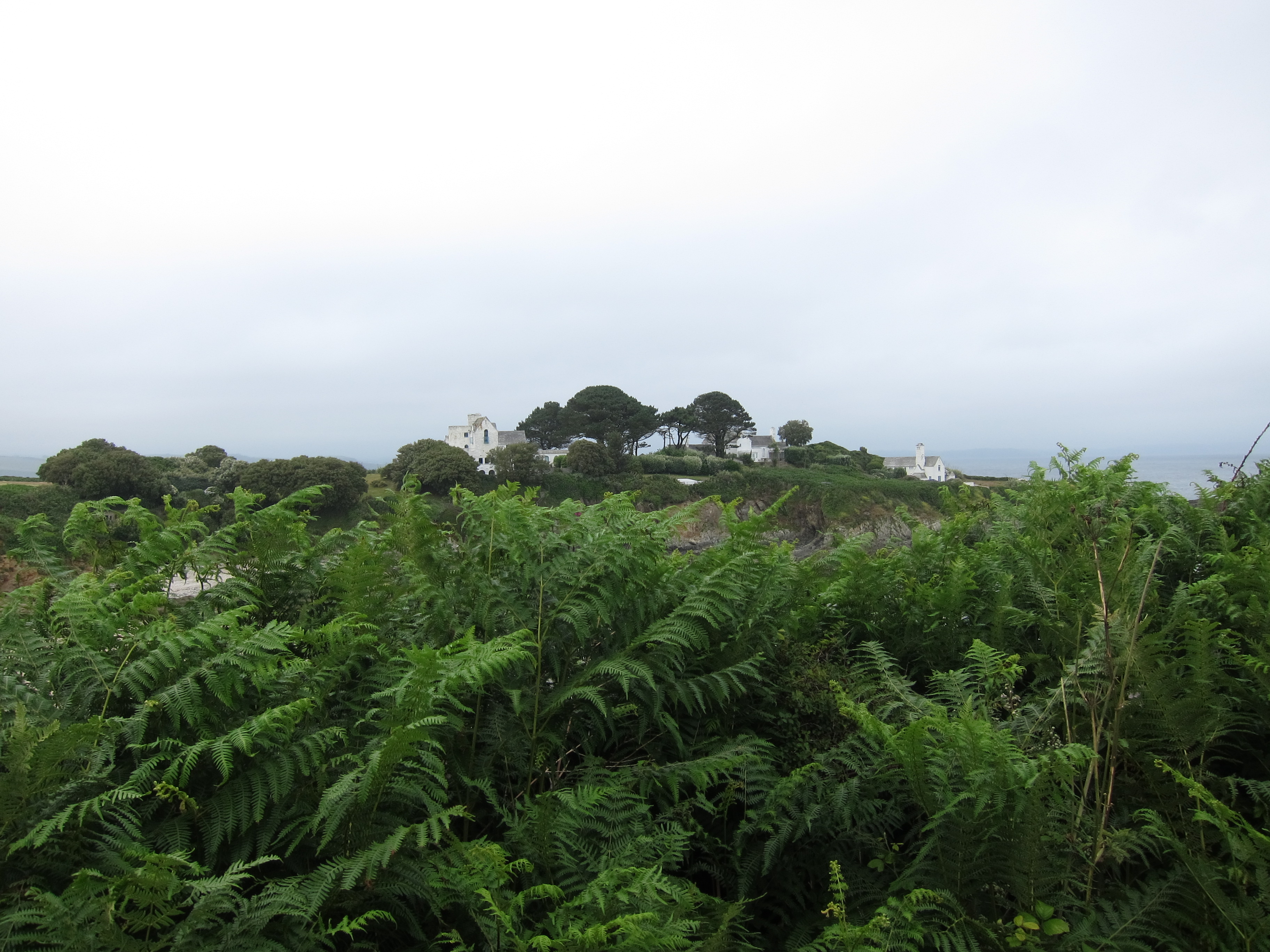 The terrain as far as Portscatho, which was just over half way, looked similar to yesterday, with much easier walking thereafter. Total planned was about 13.5 miles, same as yesterday. I set off briskly enough. The usual lack of signposting nearly took me on “dangerous unfenced cliff-path” as several signs announced. Fortunately I spotted the coast path lurking behind a hillock, so I turned my back on “dangerous” and strode off confidently. The weather was poor. Endless mizzle – not wet enough for waterproofs but making the paths greasy and hiding the view. Tony the Taxi had told me to look out for a coffee shack, called the Hidden House around one of the headlands, but, sadly, it lived up to its name, so no morning coffee.
