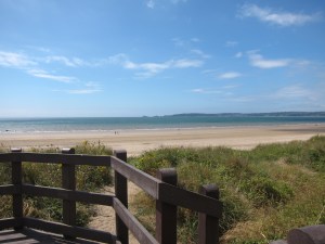 Back on the path, we went round the headland, and found ourselves overlooking Three Cliffs Bay. The path then deviates into Pennard Burrows – as one might guess from the name, this is a series of sand-dunes – not brilliant for walking in, and easy to lose the path, but, with the general lay of the land, not possible to get lost, even though you have to go slightly inland, towards a ruined church, as there is only one place to cross the little stream – a series of stepping stones. There were quite a few people about by this time, with dogs and children as the rain had stopped.