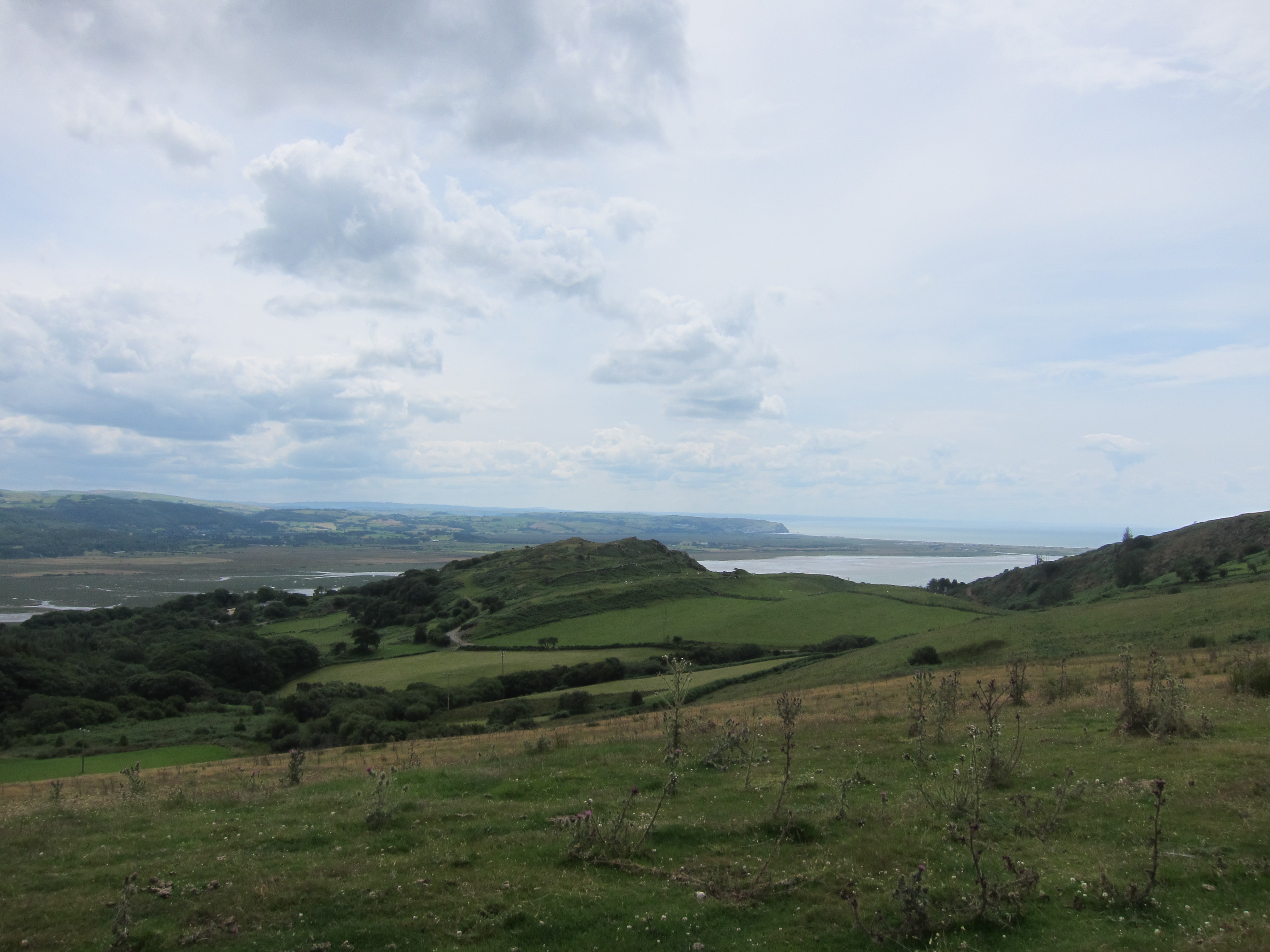 The path then ran out the back of the club along a grassy track, into woodland, and eventually across a sheepfield where I met two Scottish women whoβd come over the top from Tywyn and were making for Machynlleth β definitely a harder route. The track then dropped down across the main road again onto a side road that climbed and climbed, before turning into a long track across the hillside. It is called the Panorama Track, and no prizes for guessing why β the whole of the Dyfi estuary could be seen, with the mountains to the south, and the Cader Idris range to the north, then out to the west, the sea was gleaming in the distance. It was a long walk, but absolutely wonderful. Definitely some of the best views of the entire walk so far although because the sun was not bright, the photos don’t do it justice.