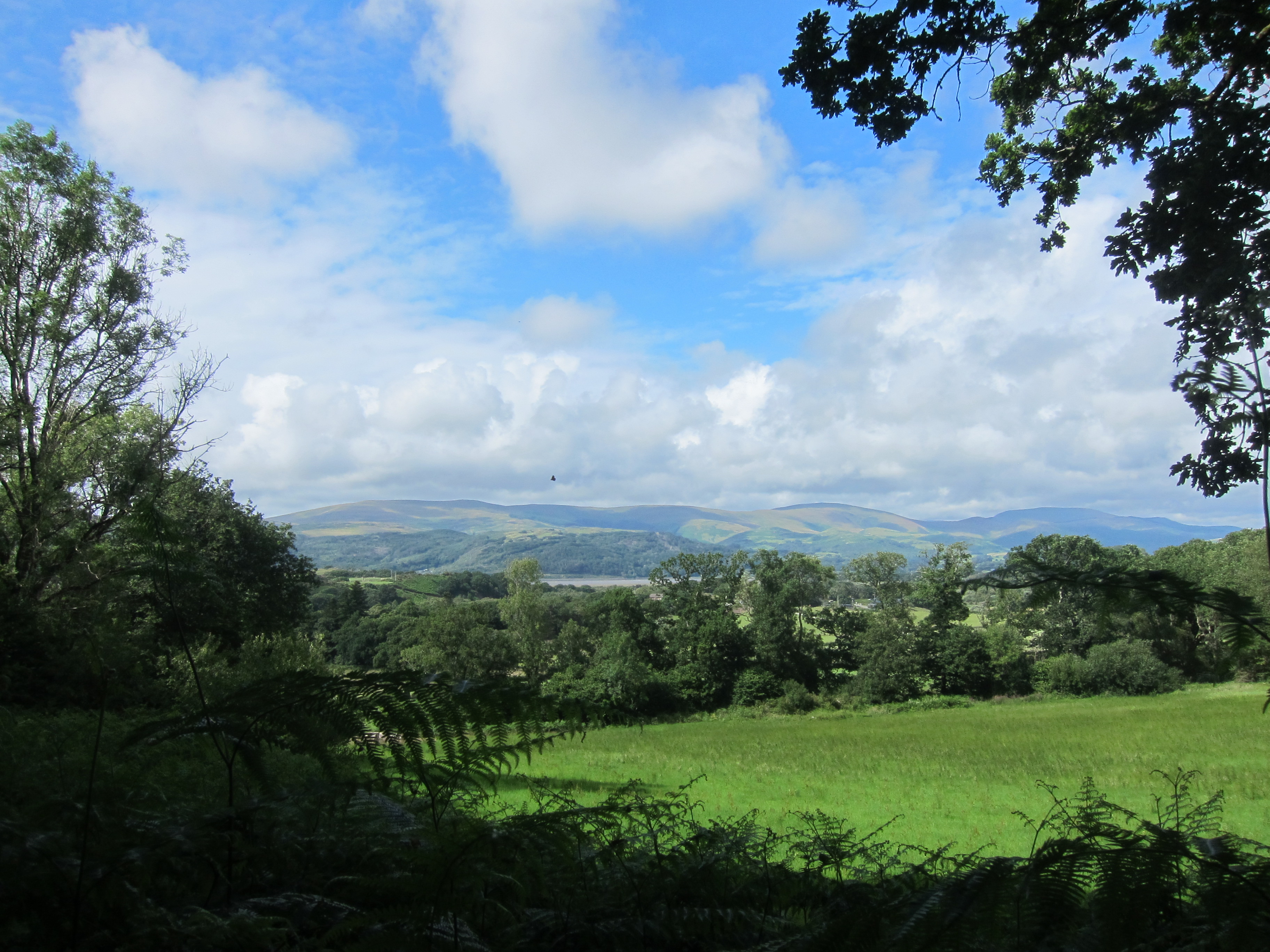 The path then ran out the back of the club along a grassy track, into woodland, and eventually across a sheepfield where I met two Scottish women who’d come over the top from Tywyn and were making for Machynlleth – definitely a harder route. The track then dropped down across the main road again onto a side road that climbed and climbed, before turning into a long track across the hillside. It is called the Panorama Track, and no prizes for guessing why – the whole of the Dyfi estuary could be seen, with the mountains to the south, and the Cader Idris range to the north, then out to the west, the sea was gleaming in the distance. It was a long walk, but absolutely wonderful. Definitely some of the best views of the entire walk so far although because the sun was not bright, the photos don’t do it justice.