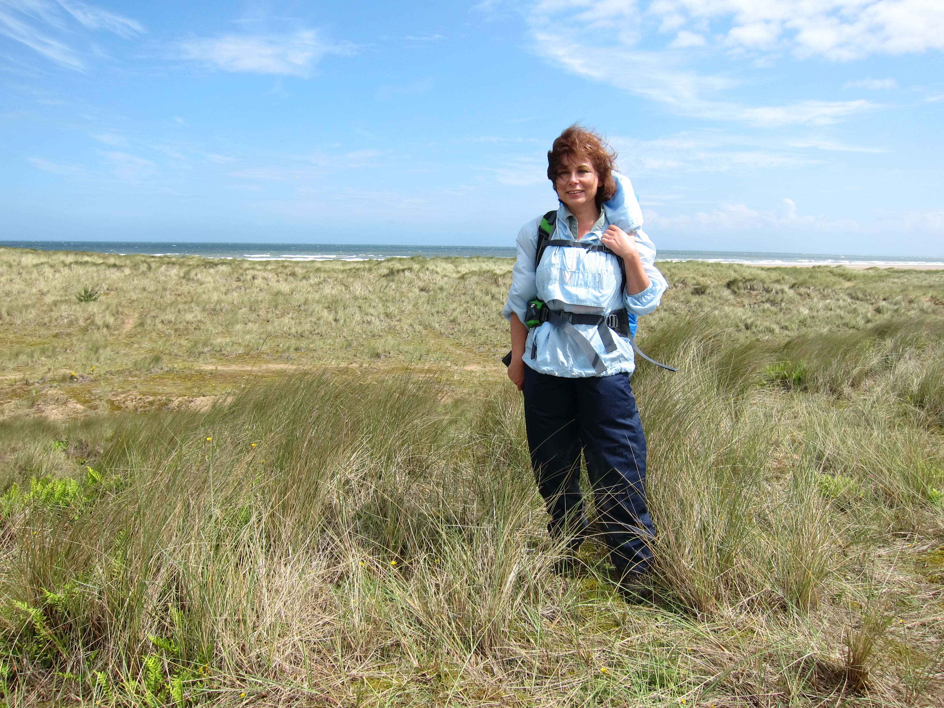 There are huge numbers of seabirds of all sorts, and also, sadly, lots of jellyfish exposed to the beating sun. Signs warned walkers about walking too close to plover nests. I did not see any although I am sure I wouldn’t recognise them anyway. But I did see a lot of oystercatchers. The whole area seems to be managed by the RSPB. On the inland side is a lagoon, with a steep bank between the lagoon and the beach along which is the foot path.